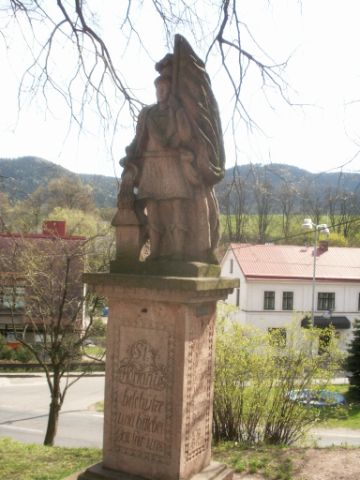 mit unseren Spendengeldern renovierte Statue des hl. Florian vor dem Kircheneingang