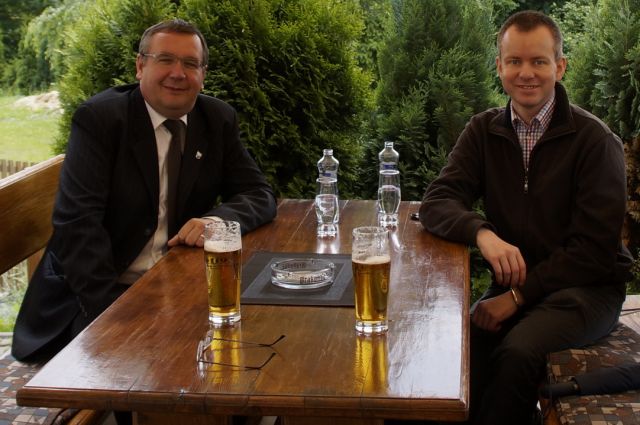 Bernsdorfs Bürgermeister Václav Schreier und Heimatortsbetreuer Peter Stächelin auf der Terasse der Pension Diana in Schatzlar