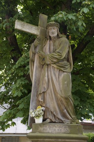 Aufschrift der Statue: Nimm dein Kreuz auf dich und folge mir nach