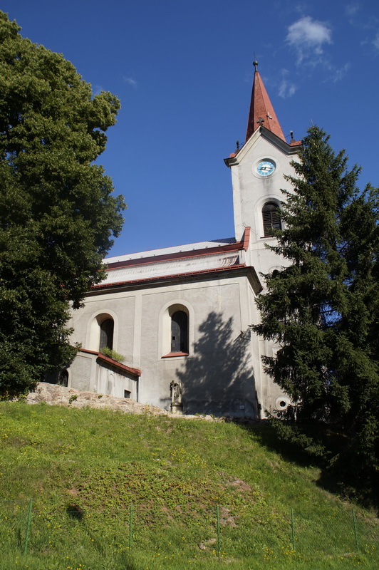 Bernsdorfer Kirche, vorne die beschädigte Friedhofsmauer